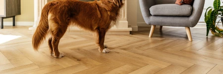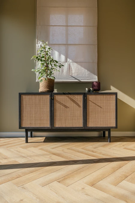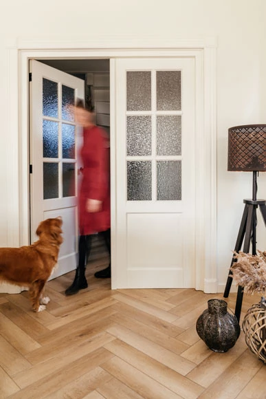 Podczas poszukiwań pięknej, naturalnej podłogi w jodełkę para natknęła się na Parquetvinyl. Lore: „Zasięgnęliśmy porady w firmie GUVA w Essen, gdzie pokazano nam różne opcje. Pod względem struktury drewna, rozmiaru i koloru desek Yukon Mistral okazał się naszym faworytem!” Decydującym czynnikiem był dla nich również fakt, że Parquetvinyl nie wymaga dodatkowego podkładu, ponieważ jest zintegrowany z podkładem w postaci deski. Aby zaoszczędzić czas i pieniądze, chcieli również kupić podłogę, którą mogliby umieścić na istniejących płytkach.