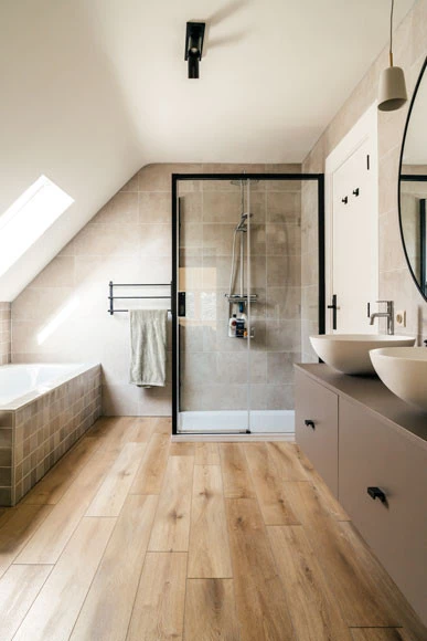 Lore i Bart położyli Parquetvinyl także w górnej części domu. Tutaj wybrali zwykłe deski o tym samym kolorze i strukturze, co deski na dole”. Podłoga została zamontowana na istniejącym podkładzie na całej powierzchni: od przedpokoju po sypialnie, garderobę i łazienkę. Lore: „Nie szukaliśmy podłogi o wyglądzie drewna do łazienki, ale ciepło – zarówno pod względem uczucia pod stopami, jak i wyglądu – jest teraz dużym plusem. Łazienka stała się przytulna i wodoodporna. Dokładnie tak, jak to sobie wyobrażaliśmy”.