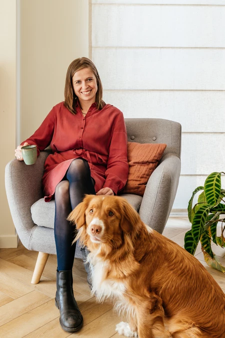 Psycholog dziecięcy Lore podążyła za miłością i zamieniła rodzinne miasto Brasschaat na rustykalne Essen, na granicy z Holandią. Mieszka tutaj razem ze swoim partnerem Bartem, triatlonistą i trenerem sportowym, oraz psem Nura w ich świeżo wyremontowanym domu. „Przestrzeń na praktykę i piękny widok były naszymi jedynymi wymaganiami, gdy szukaliśmy własnego domu” – mówi Lore. Znaleźli je w wolnostojacym domu, który jest skąpany w świetle i oferuje widok na pola.
