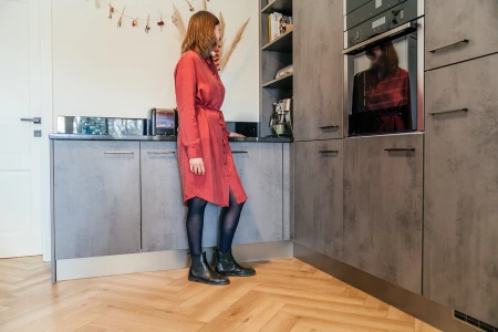 Lore: „Nawet nie braliśmy pod uwagę parkietu. Zdecydowanie postawiliśmy na wygodę i każdego dnia jesteśmy zadowoleni z naszego wyboru Parquetvinyl. Nie musimy się martwić, gdy podczas podlewania roślin rozlejemy wodę lub gdy przewróci się kieliszek wina. Zabrudzenia po gotowaniu można łatwo wyczyścić. Sierść Nury jest również ledwo zauważalna ze względu na wzór na deskach”.