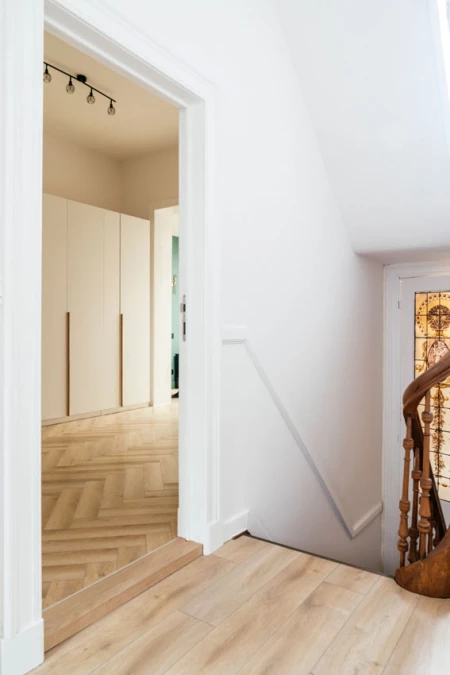 Para wybrała kolekcję Yukon Mistral Herringbone i połączyła ją ze zwykłą kolekcją Yukon Mistral. Ta kolekcja charakteryzuje się delikatnymi, naturalnymi kolorami i spokojną fakturą drewna z pojawiającymi się gdzieniegdzie sękami. W korytarzu i łazience zdecydowali się na proste deski, podczas gdy w sypialniach wybrali podłogę w jodełkę, aby uzyskać wyjątkowo szykowny i elegancki efekt. An: „Musiałam i chciałam mieć podłogę w jodełkę. Doskonale wpasowuje się w autentyczne elementy naszej kamienicy, ale także pasuje do nowoczesnych mebli.”