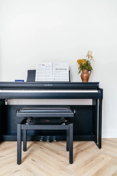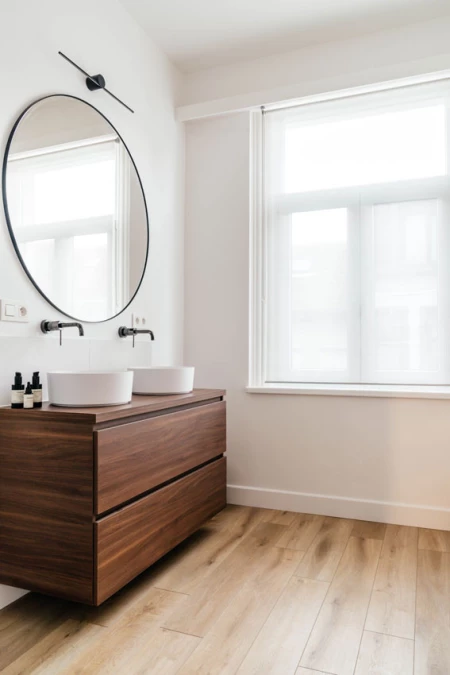 Nie przeprowadzili montażu samodzielnie. Erik: „Jesteśmy dość niezdarni, a wzór w jodełkę nie jest tak oczywisty w montażu. Aby uniknąć marnotrawstwa materiału i utrzymać odpowiednie tempo pracy, skorzystaliśmy z pomocy ekspertów. Podłogi musiały również zostać wypoziomowane, czego nie mogliśmy zrobić sami. Dla wygody wybraliśmy proste deski w korytarzu i łazience, łatwiejsze w montażu w tych małych przestrzeniach. Parquetvinyl jest całkowicie wodoodporny, jakie to wygodne!