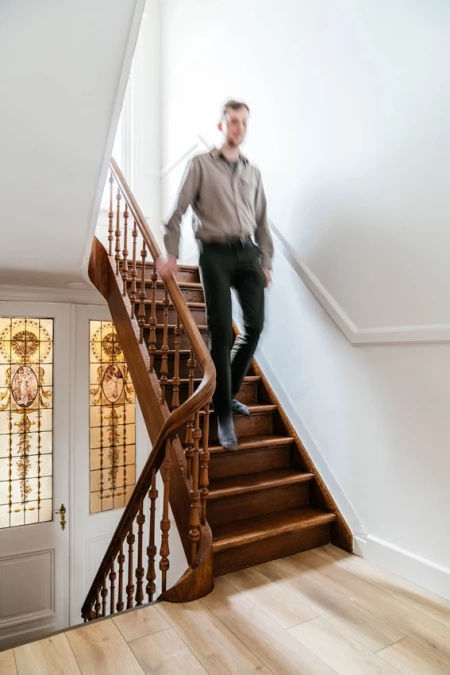 Erik lubi nowoczesne wnętrza, podczas gdy serce An bije szybciej na myśl o autentyczności i wdzięku. Kamienica okazała się doskonałym kompromisem. Drzwi wejściowe z kutego żelaza, charakterystyczne drewniane schody i inne piękne elementy, takie jak świetlik i malowane drzwi, pozwoliły im zachować resztę wnętrza w dość stonowanym stylu. An: „Dopiero tu zamieszkaliśmy, więc oczywiście musimy jeszcze trochę 'dojrzeć', jeżeli chodzi o układ. Ale wszystko w swoim czasie!”
